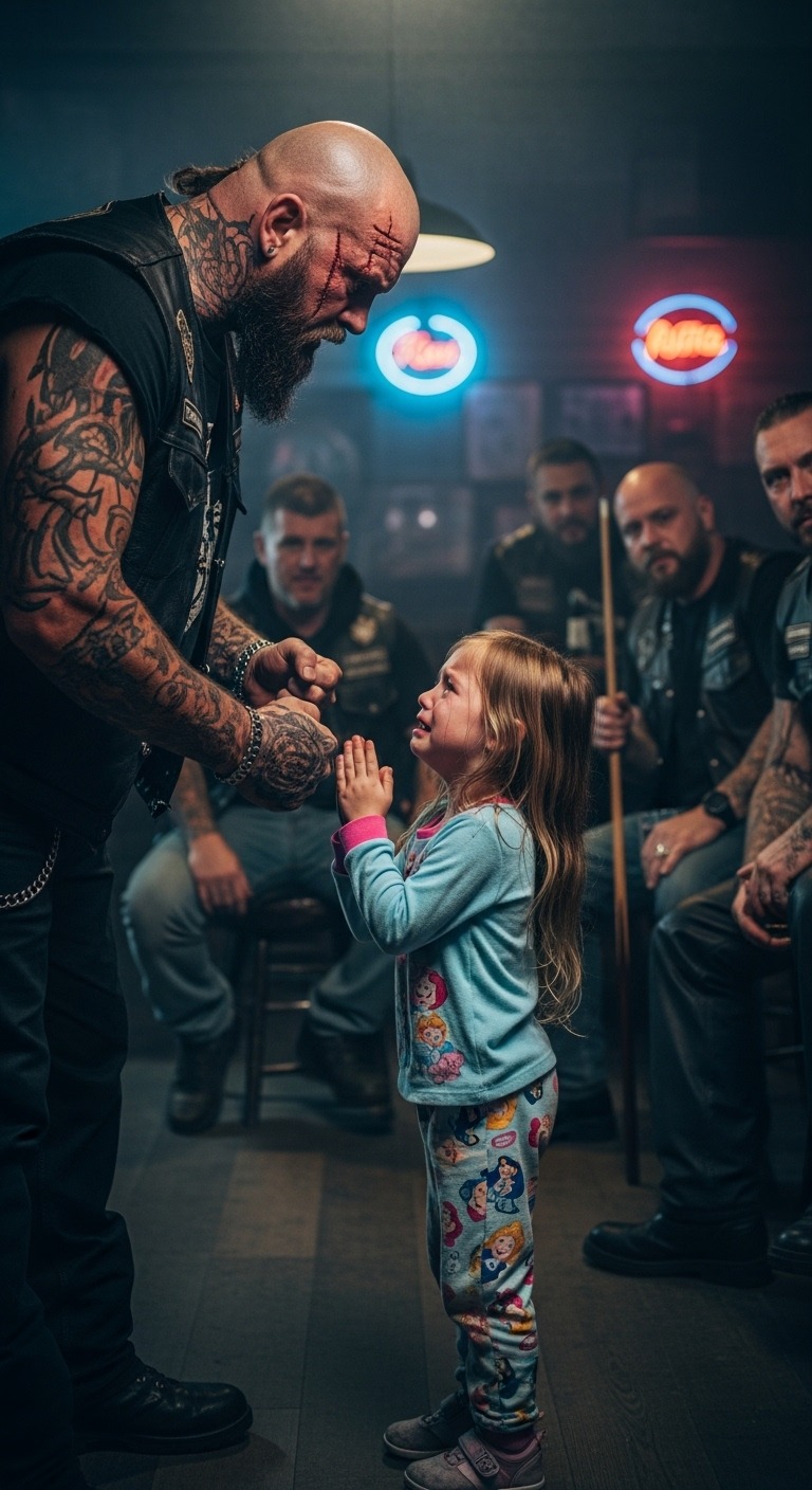 When this small girl in pajamas with Disney princesses on them stood in the doorway and cried, all the leather-clad bikers in the smoky room
