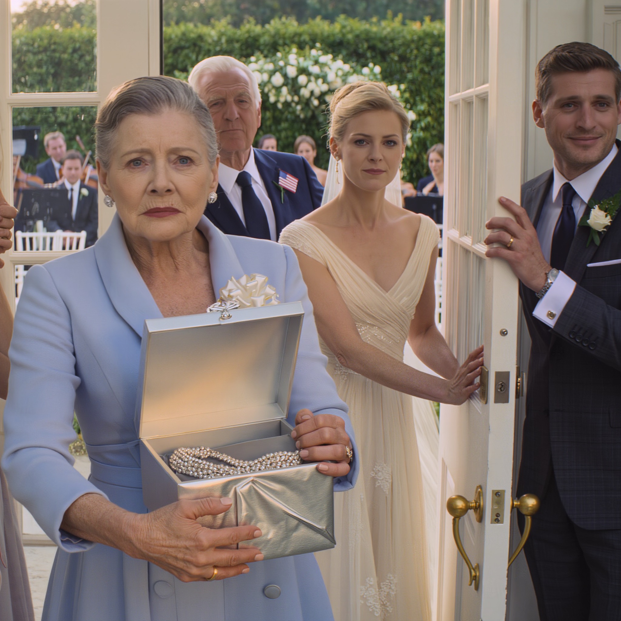 My hands were trembling as I held the silver-wrapped gift box. Behind me, my husband of forty-five years stood frozen in his freshly pressed suit.