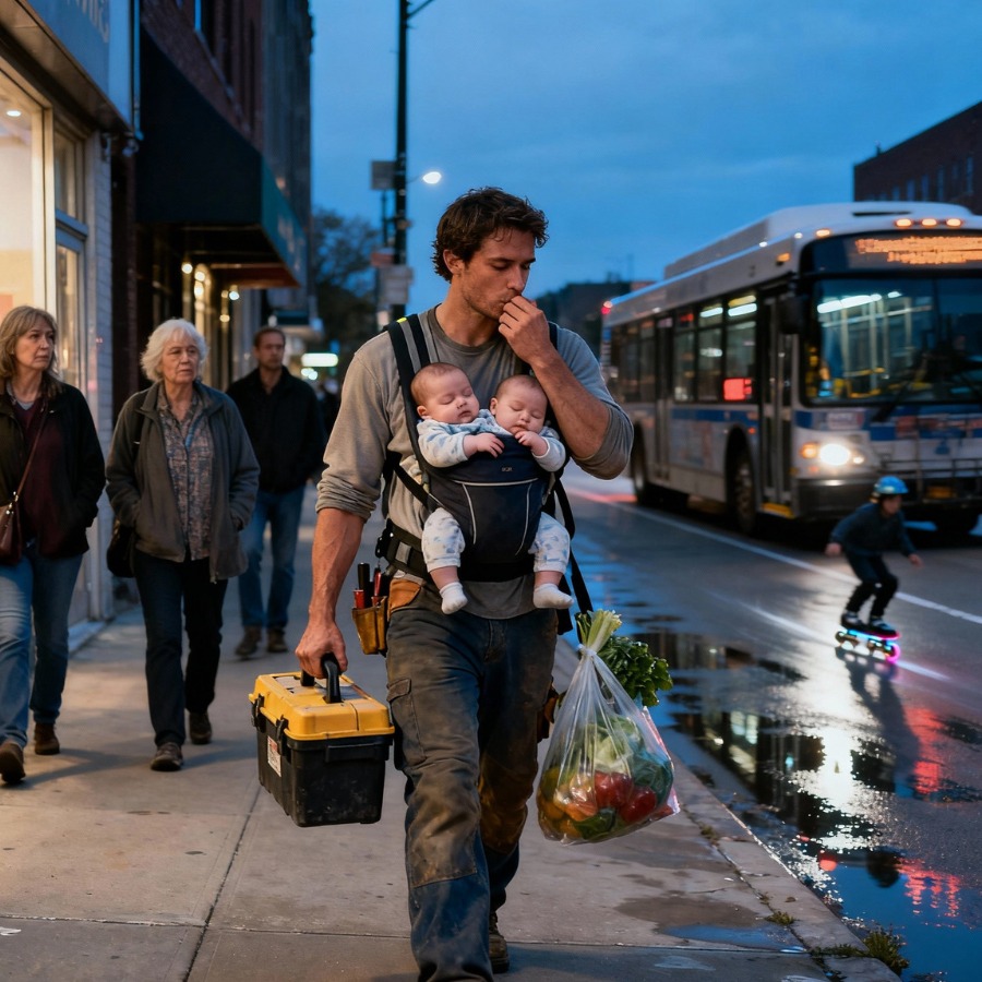 He would remember that night years later as a turning point in his life. The weight of the toolbox, the bag of groceries, and the warm, small bodies of his children on his chest would all come back to him. It wasn’t a big, life-changing event in the usual way. There were no cheers or headlines. But because it was so hard and never stopped, it became something special: a tribute to the quiet power of a man who wouldn’t give up, who carried all that mattered, and who showed what love and resilience really look like in the simplest way possible.
