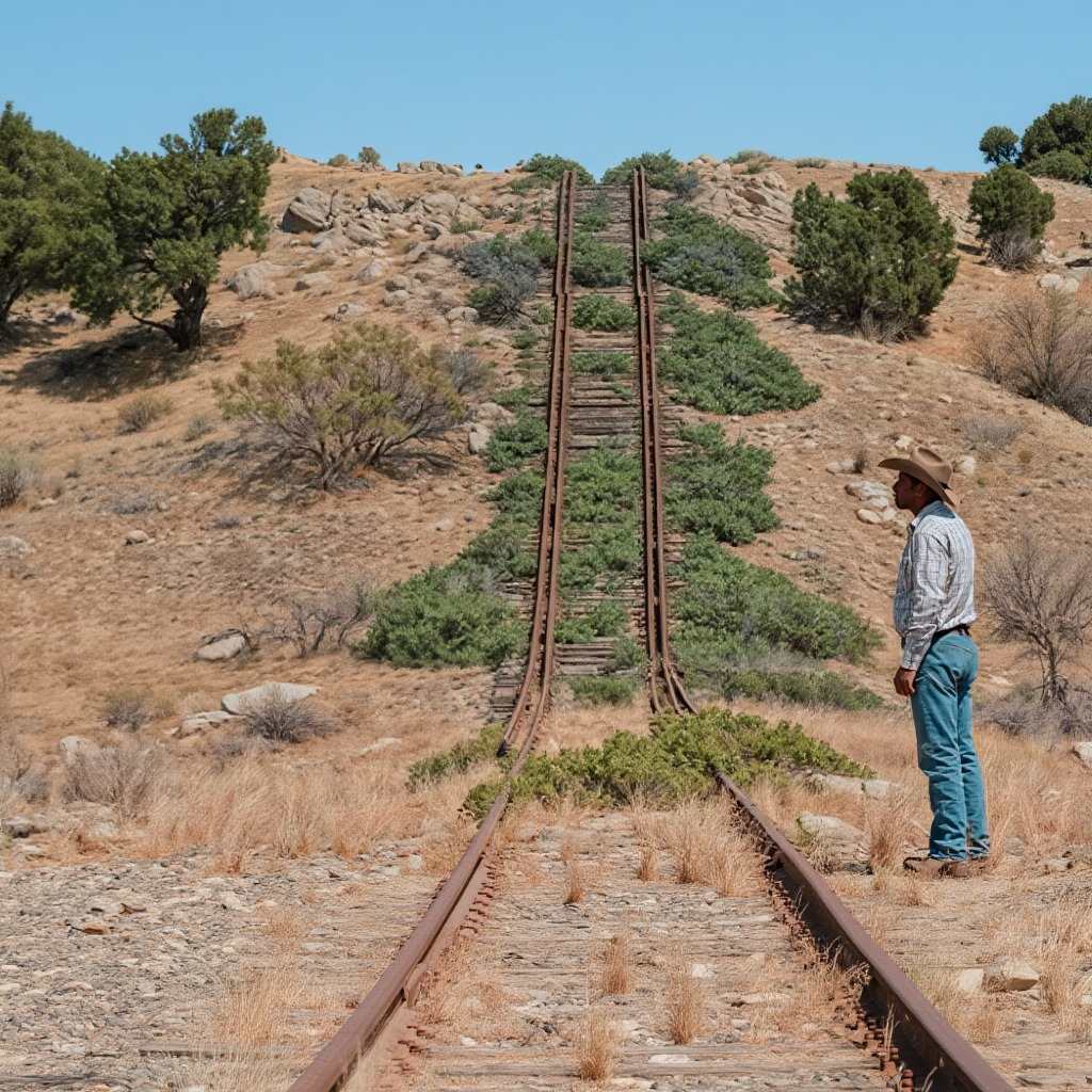 The desert shifted under his boots, sand slipping around each step. The rails remained surprisingly straight, cutting through the land as if someone long ago had insisted on defying nature itself.