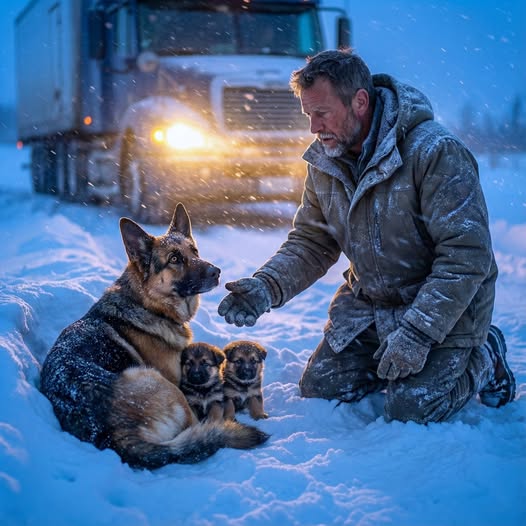 The wind howled through the mountain pass as he squinted through the passenger window. There, barely visible under a drifting bank of snow, was a large German Shepherd. Her fur was matted with ice. She was curled protectively around two tiny puppies.