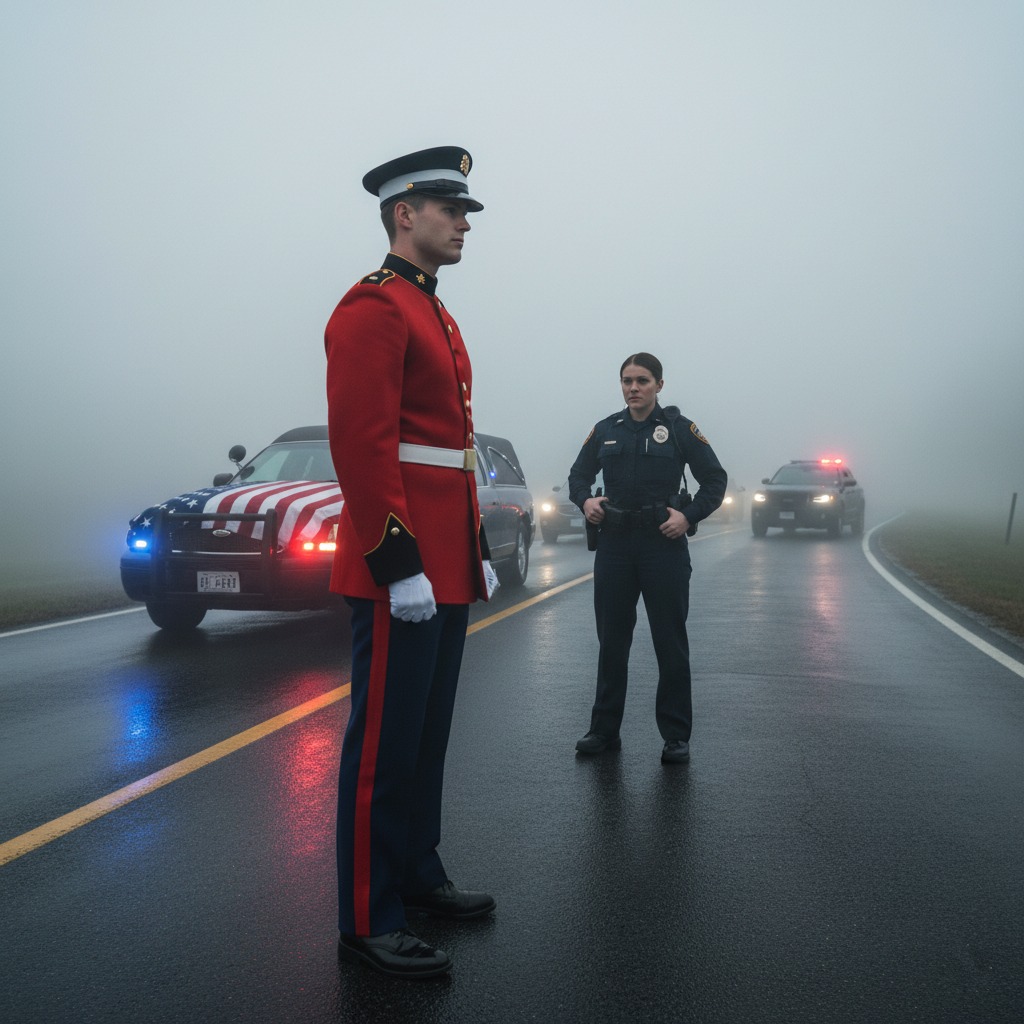The caravan stopped on a foggy road in Virginia, with blue lights blazing through the fog. A young officer with her hand on her holster faced off against Sergeant Jacob Harper, who was wearing a bright red and black tomb guard uniform. “You’re blocking the road, Sergeant.” “Move the hearse, or I’ll have to arrest you.” Jacob didn’t blink; he kept his eyes on the casket behind him, which was covered in a flag. “This is Private Ryan Mitchell’s last trip,” he added, his voice hard as steel.