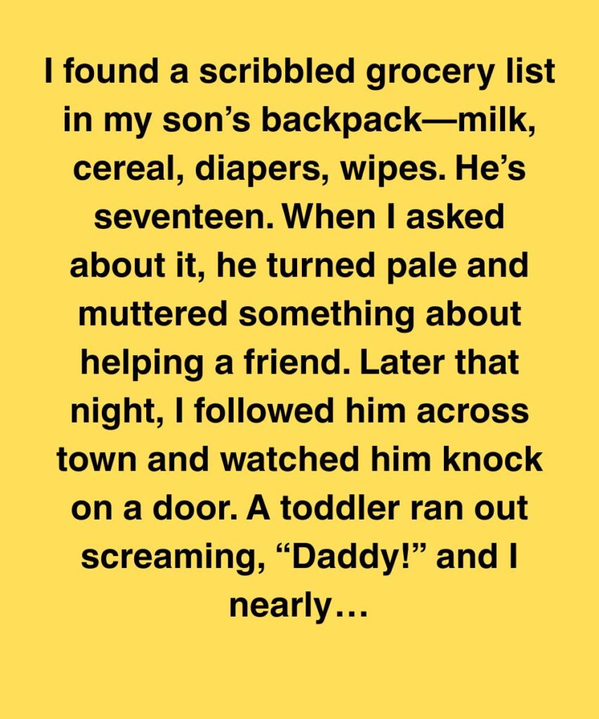 I found a grocery list in my son’s bag that was written in a hurry. It had milk, cereal, diapers, and wipes on it. He is 17 years old. When I asked him about it, he turned red and mumbled something about helping a friend. Later that night, I followed him across town and observed him knock on a door. A little kid yelled, “Daddy!” and I almost slid off the curb.