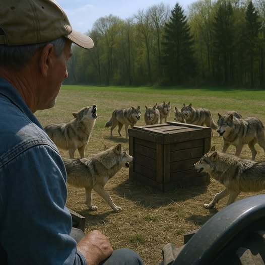 He walked down to the tractor’s step, one hand on the doorframe, and kept a tight eye on the pack. These wolves weren’t being hostile; they seemed like they were begging or desperate. When the wolves noticed him watching, the howling grew quieter, and some even backed off, as if they had accomplished their goal of getting his attention. But a few persistent ones kept scratching at the crate and growled low as they pulled on its edges.
