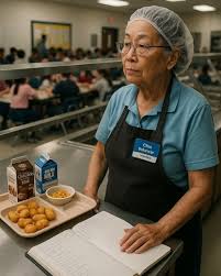 On her last day before summer break, she stood at her usual spot and watched the students file past. She corrected a tray. Slid an extra roll. Smiled without asking questions. Her cane leaned against the counter, unnoticed.