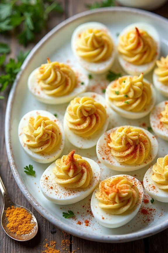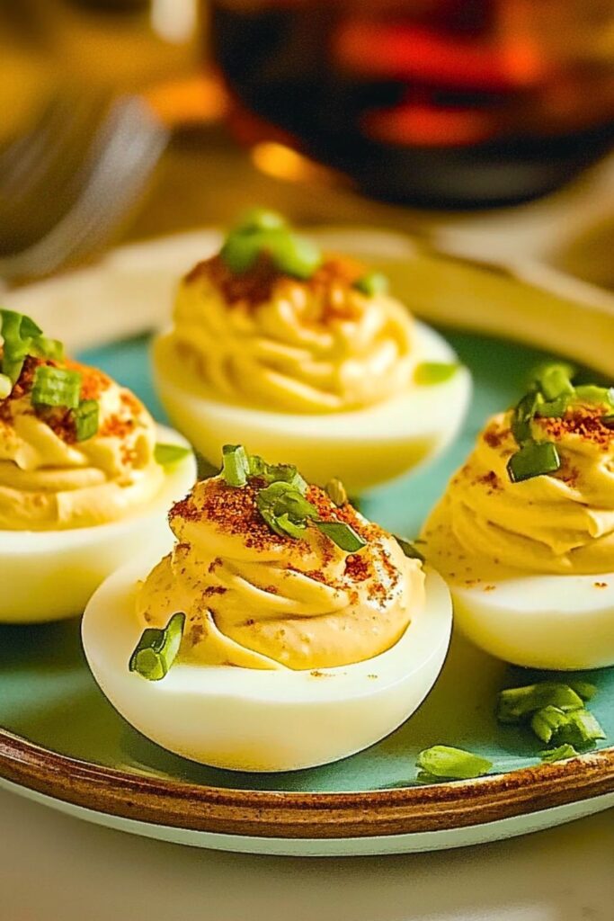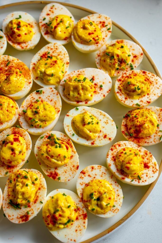 Finally, sprinkle the chopped chives that you set aside on top of the filled eggs. This last touch gives it a new flavor, color, and freshness. You can serve your deviled eggs either cold or at room temperature. You may make these a few hours ahead of time and store them in the fridge until you’re ready to eat them. Everyone will love these deviled eggs since they are creamy, well-seasoned, and a little spicy.