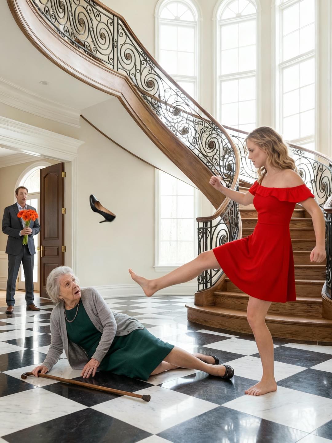 Anne—his fiancée, the woman who radiated sweetness at charity galas—stood with a posture he did not recognize. Her face was twisted in grotesque fury, and her leg was raised, the stiletto heel pointed downward like a weapon.
