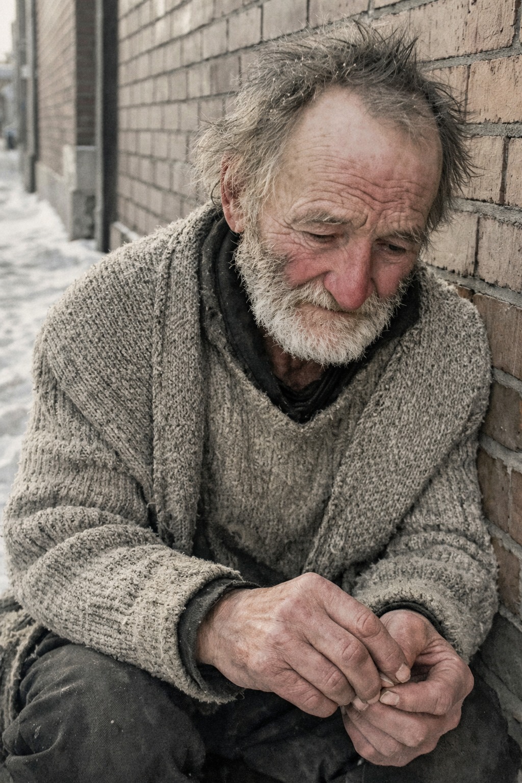 It was early and bitterly cold when I noticed the man sitting near the grocery entrance downstairs. He looked older than he probably was, shoulders hunched, hands shaking, eyes tired in a way that suggested long years rather than one bad night.