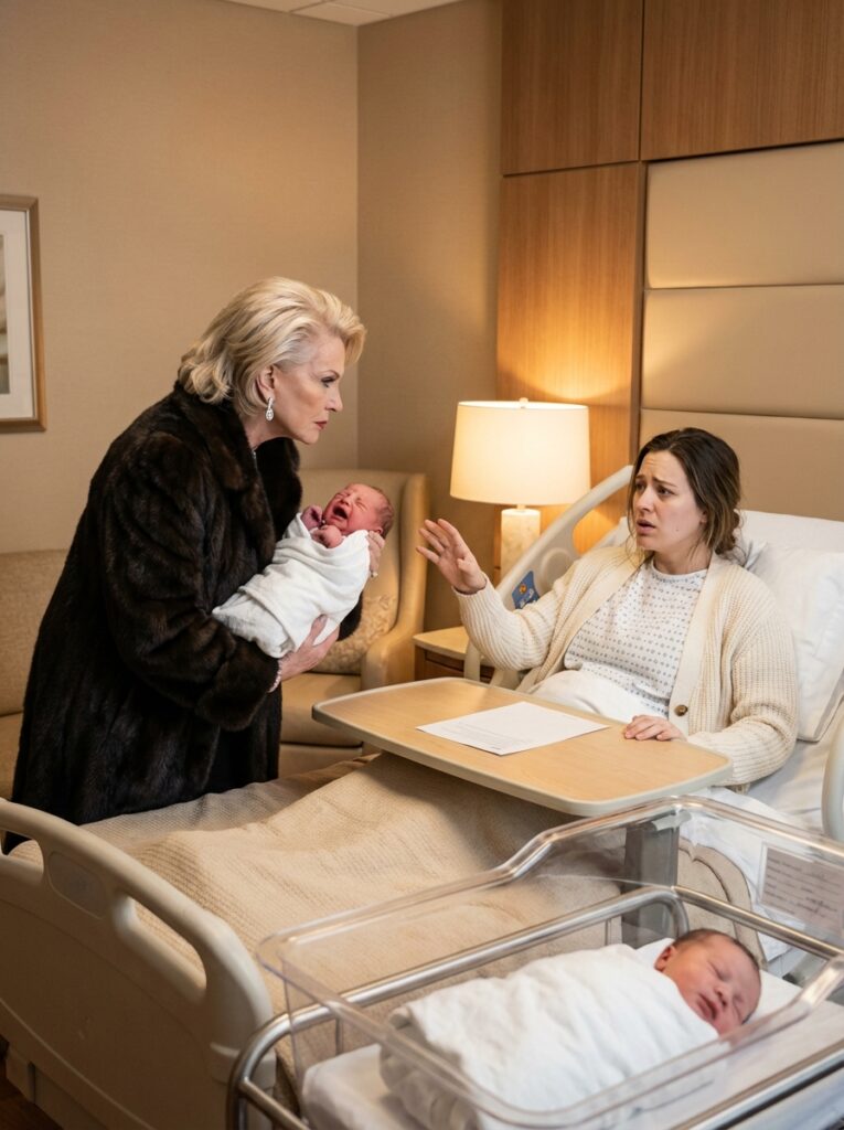 She wore a fur-trimmed coat, sharp heels, and the kind of expensive perfume that arrived in a room before kindness ever could. Her presence filled the suite instantly, turning the air hard.