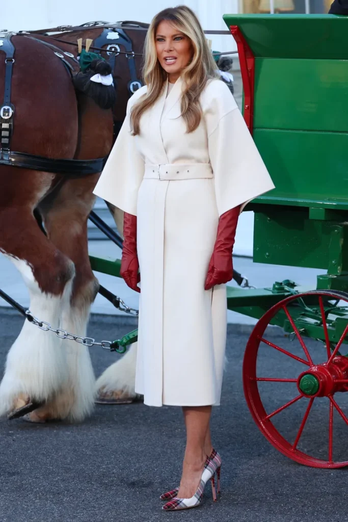 There was nothing subtle about Trump’s look. She wore a clean Dior coat with bright red leather gloves and tartan-patterned Manolo Blahnik stilettos to go with her winter-white outfit. The striking juxtaposition of wintry beauty and bright holiday colors drove the internet crazy.