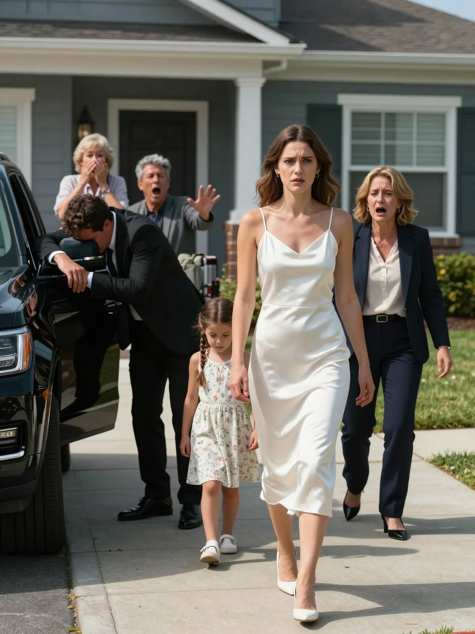 And there, sitting in the driveway like a threat wrapped in black steel, was a long armored SUV polished so perfectly it looked unreal. Beside the rear door stood a man in a charcoal suit holding a tablet.