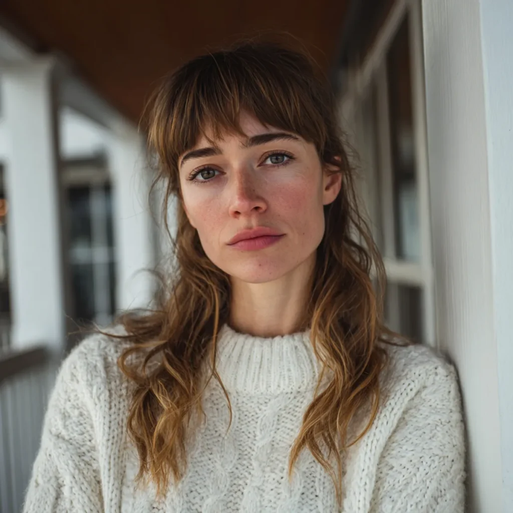 A pensive woman wearing a white sweater