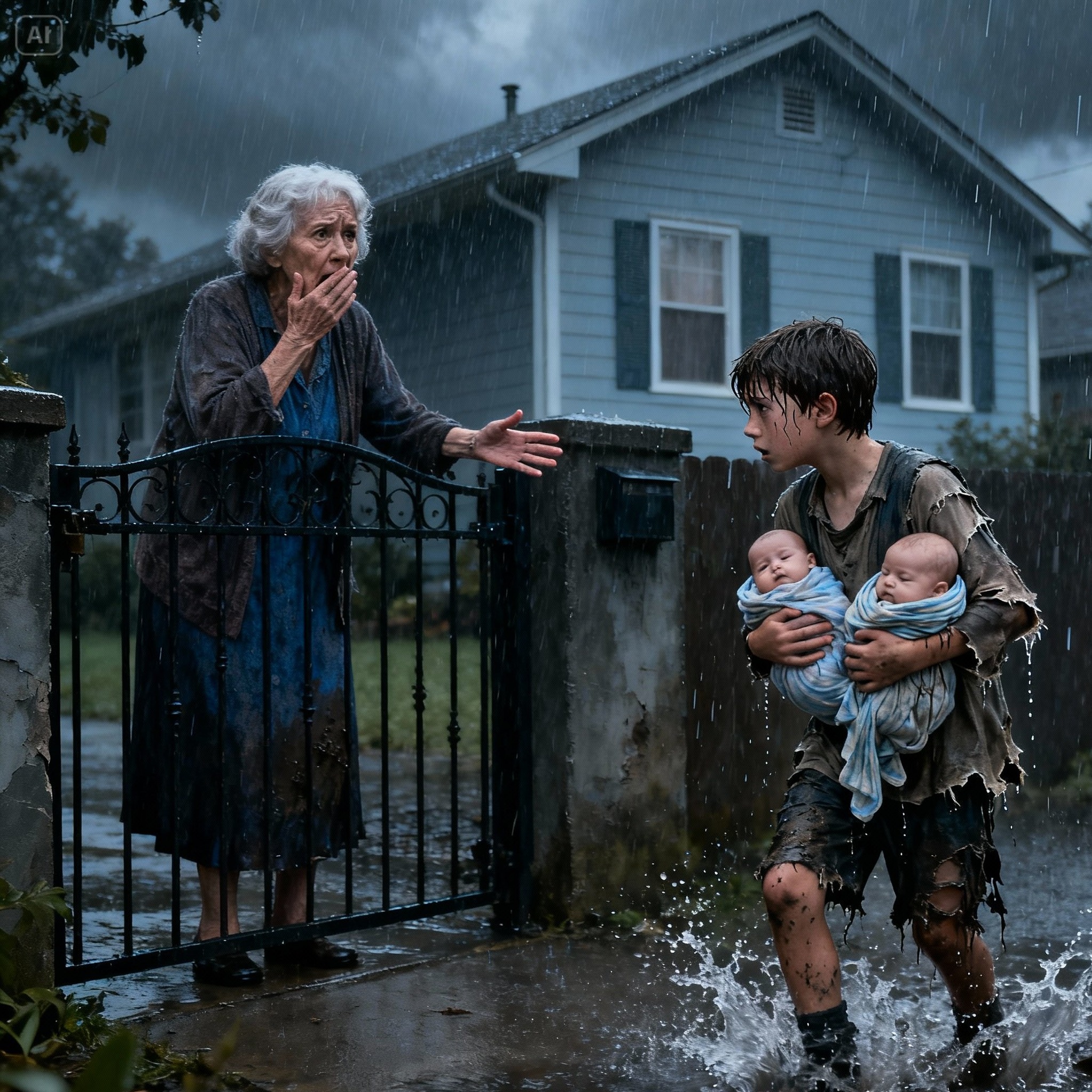 looked closely. The youngster, who looked to be ten or eleven, was soaked to the bone. He fell to his knees when he got to the gate and wrapped his arms around two small bundles.