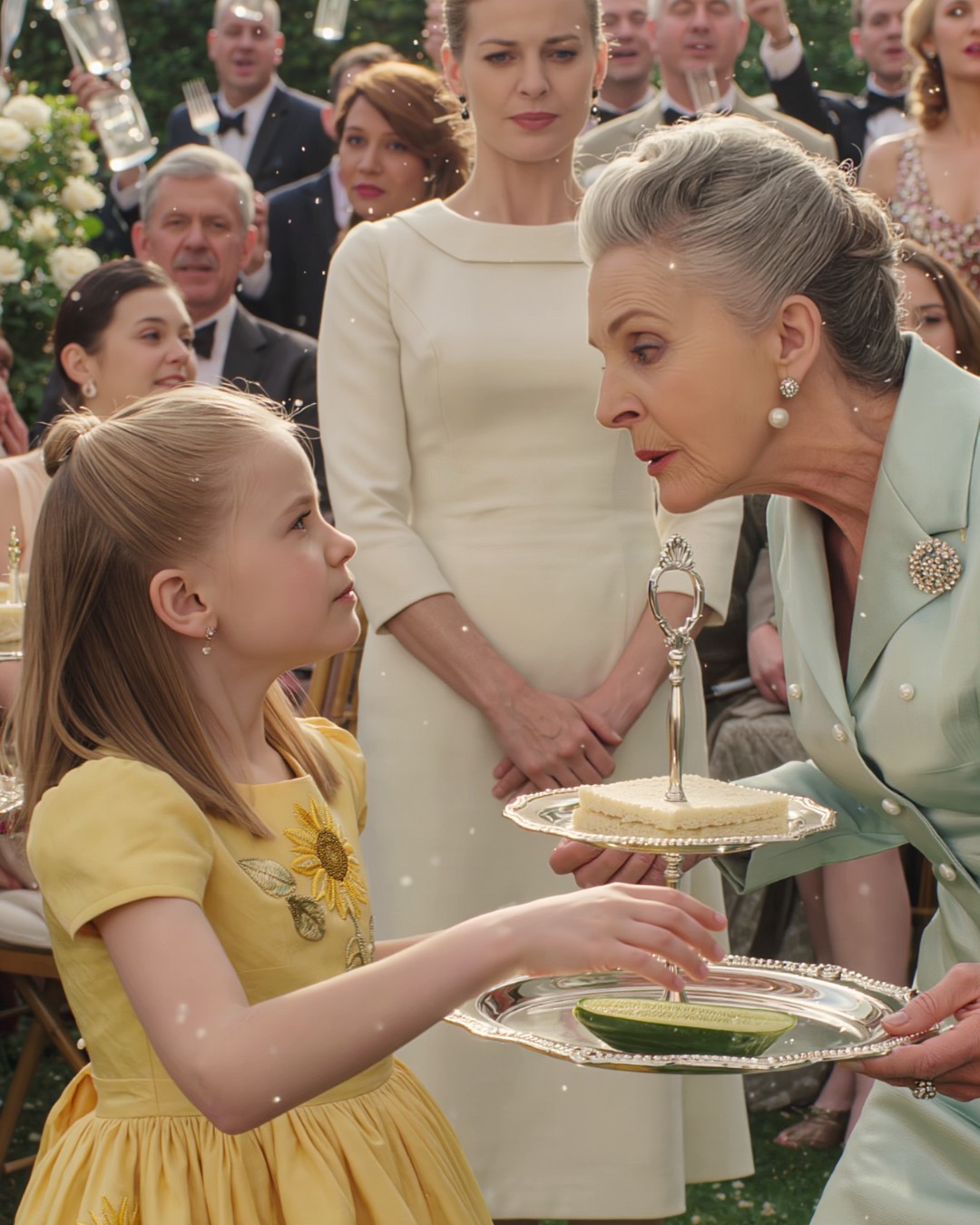 Her fingers had almost grasped the edge of a sandwich when a hand shot out, faster than I’d seen my mother move in years. The platter jerked away, the entire tiered tray lifting from the table in one swift motion.