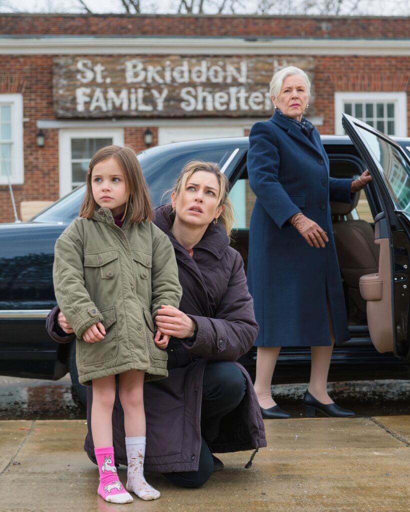 Her gaze found me first. For half a second, her expression looked… wrong. Recognition, then confusion, then something else I couldn’t name. Her eyes flicked to the sign above the shelter entrance, then back to me. Then they dropped to Laya.