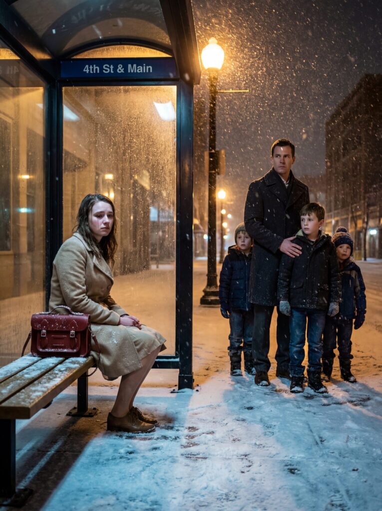 Snow came down in thick, steady sheets that December night, the kind that softened the city’s edges until every streetlight looked wrapped in gauze, and every sound seemed to land with a muffled hush, as if the whole world had decided to speak more gently. At a bus stop off Alder Street, where the plexiglass panels were streaked with ice and the posted schedule curled at the corners, a twenty-eight-year-old woman named Maren Holloway stood with her arms crossed tight over her chest, not so much hugging herself as trying to keep her own body from drifting away into panic. Her dress was a slim, olive-toned piece that would have looked perfectly at home under warm restaurant lighting, paired with a coat she no longer had, but out here it seemed almost absurd, like a costume worn in the wrong play.