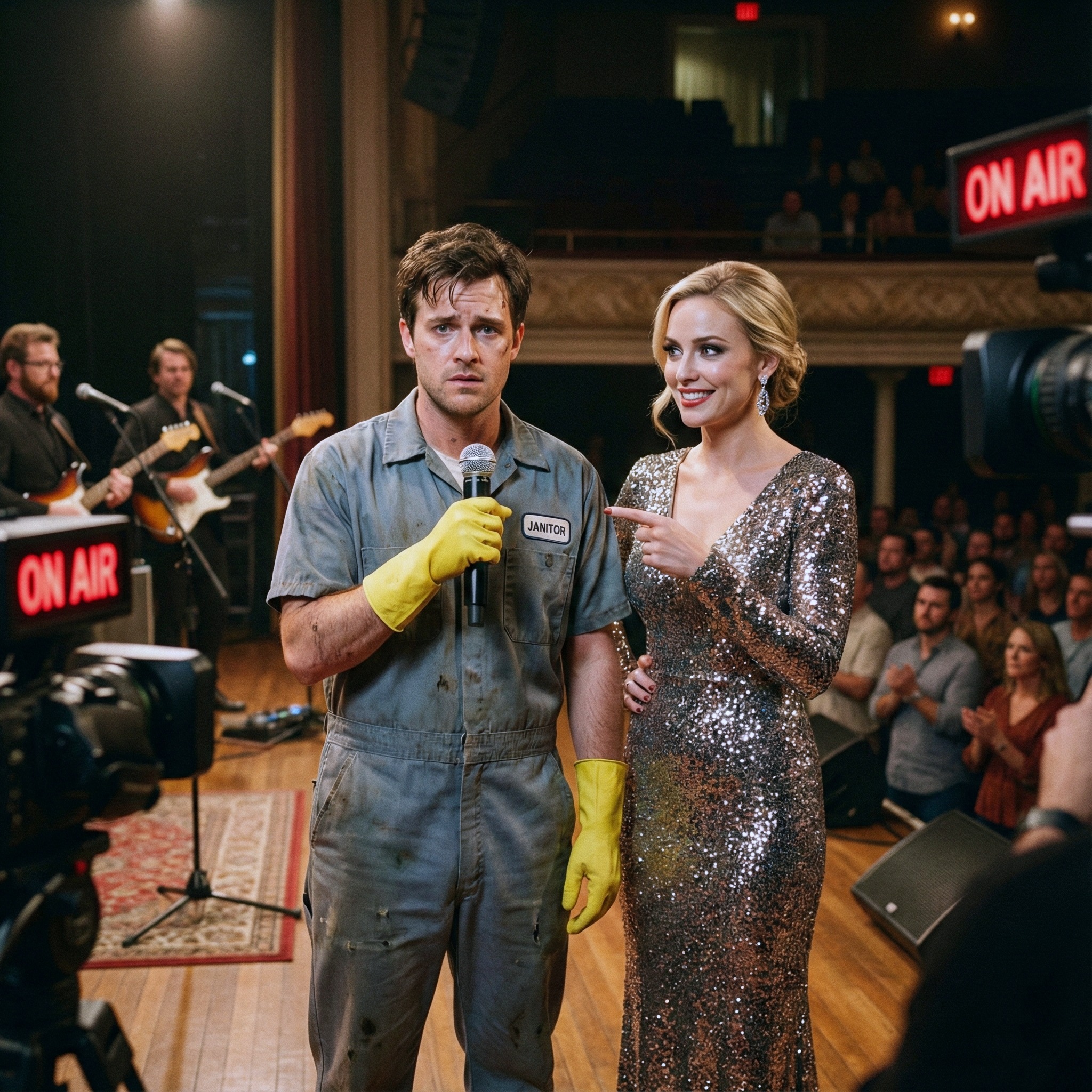 The lights snapped around, and 500 heads turned. The camera zoomed in. Cole stood there in a janitor’s uniform, yellow rubber gloves still on his hands, a cleaning cloth draped over his shoulder.