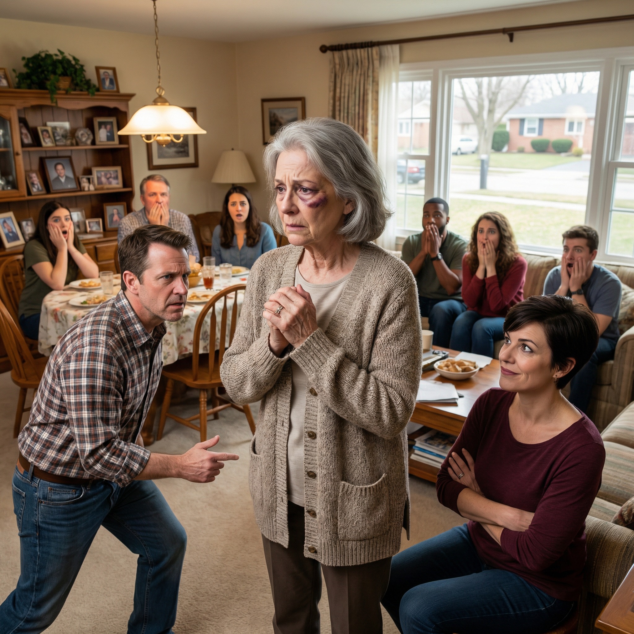 I turned seventy on a Sunday afternoon, the kind of quiet milestone you don’t expect to celebrate loudly. My sons insisted on a family gathering anyway—nothing fancy, just a roast, a cake, and polite smiles in my oldest son’s living room. I almost didn’t go. The dark bruise beneath my left eye throbbed, a purple-and-yellow reminder I’d tried to hide with makeup that morning. It hadn’t worked.