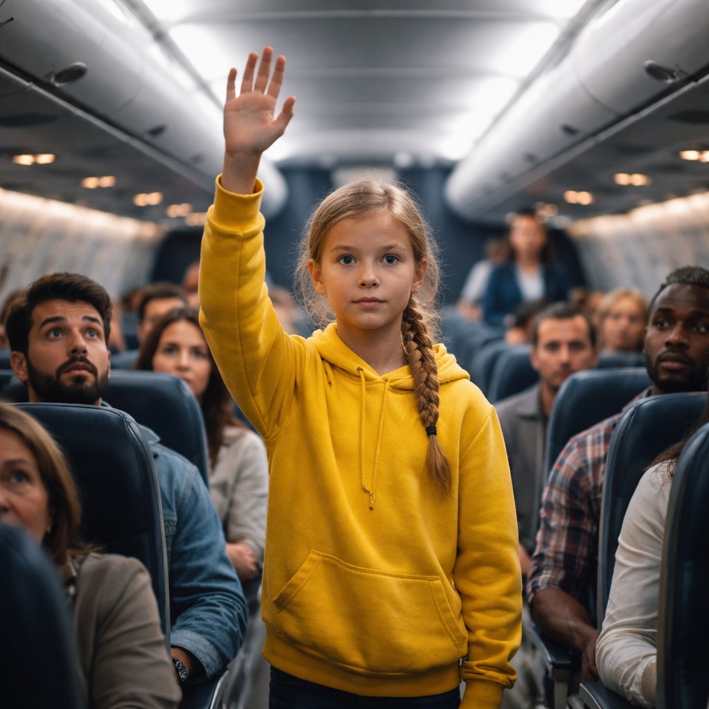 At first, nobody noticed. The cabin was too loud. The panic had not organized itself into attention yet. Then a woman across the aisle looked up and froze. She nudged the man beside her. He followed her gaze. He saw the girl standing motionless with her hand raised and went quiet. Then the row behind them noticed, then the row behind that, until a ripple of baffled stillness began pushing through the noise.