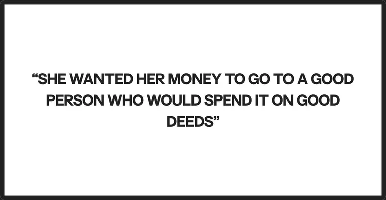 Mr. Johnson stated, “She wanted her money to go to a good person who would spend it on good deeds.”