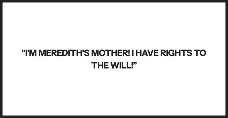 “I don’t give a damn! Meredith’s mother is me! My mother said, “I have rights to the will.”